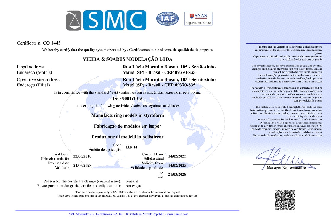 A Vieira e Soares Modelação está atuando no mercado há 20 anos produzindo modelos/moldes em STYROPOR para ferramentas na área de estamparia, máquinas e fundidos em geral. Nossas atividades vão desde uma simples usinagem até alta tecnologia.